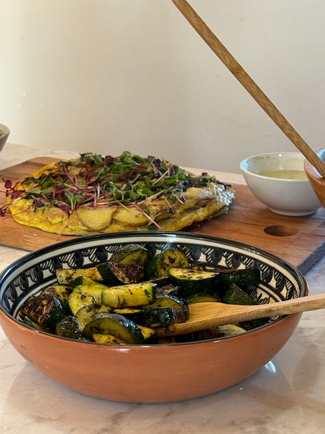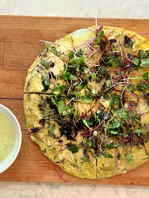 Spanish Tortilla with microgreens and parsley sauce, plus roasted za’atar zucchini.