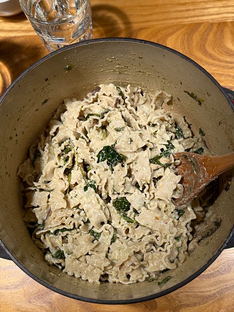 Creamy Mixed Mushroom Pasta with wilted spinach and a side arugula salad with homemade gluten-free bread.